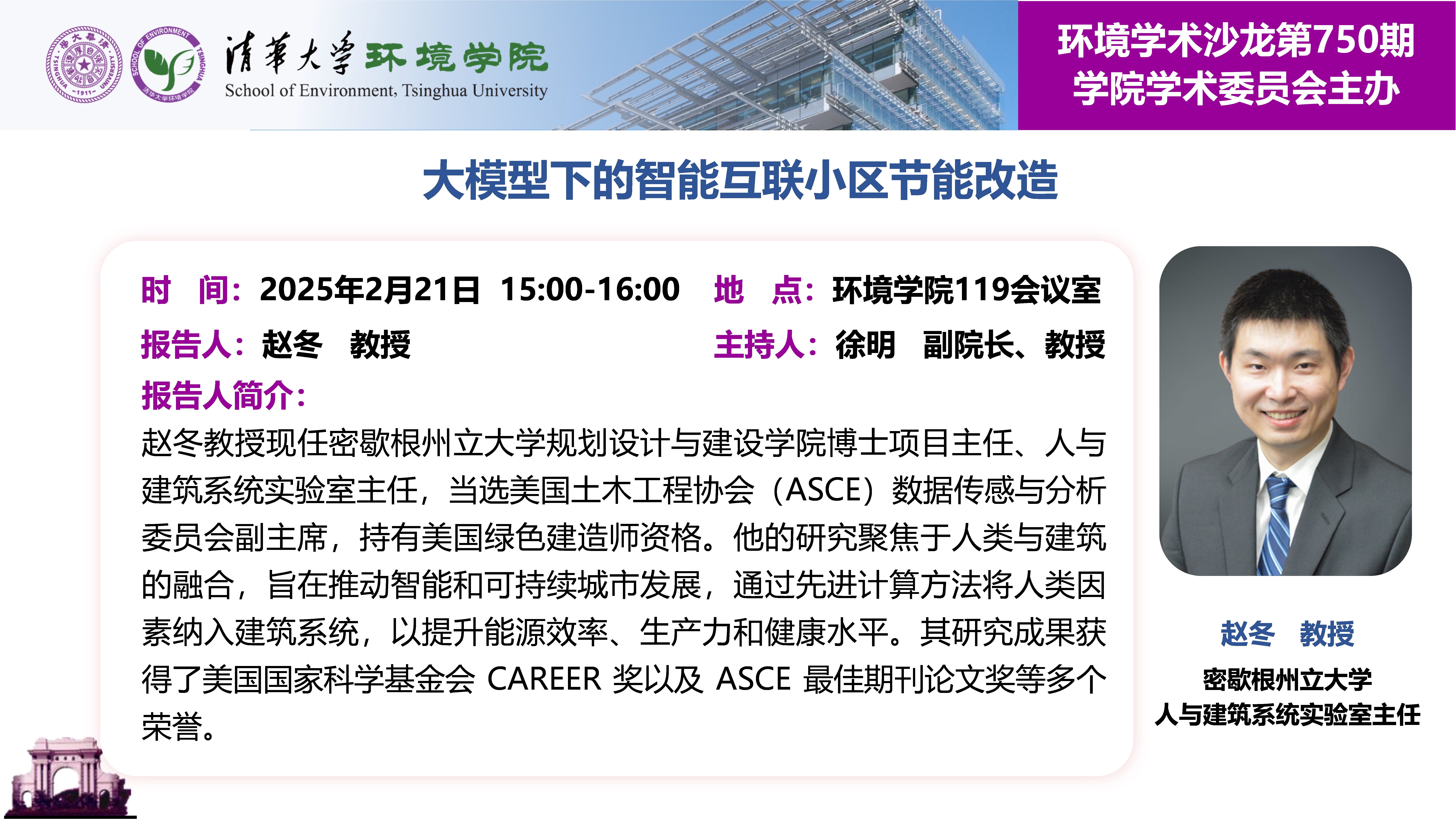 报告人:赵冬 教授,密歇根州立大学人与建筑系统实验室主任