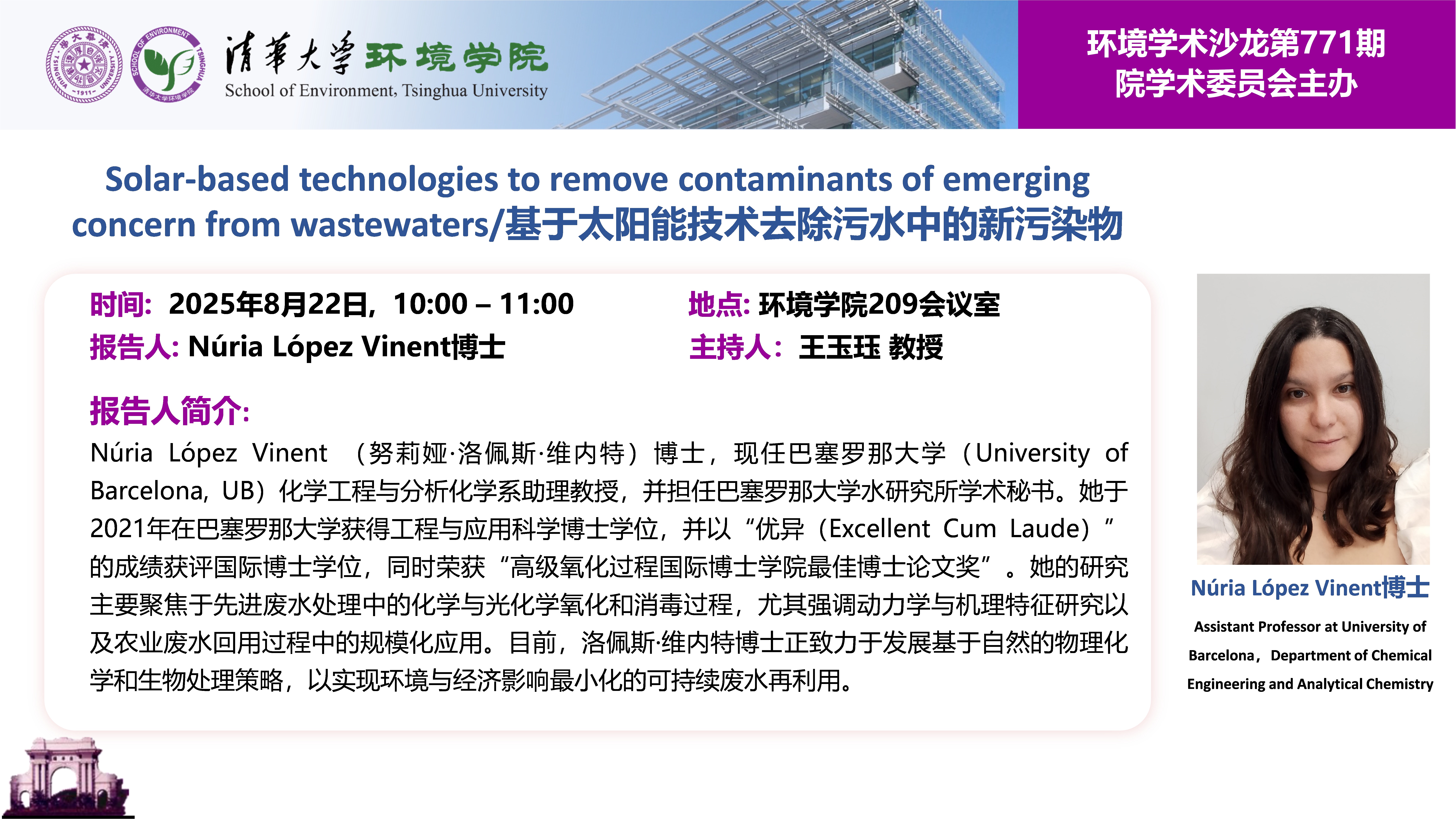 报告人:Núria López Vinent博士,巴塞罗那大学(University of Barcelona, UB)化学工程与分析化学系助理教授