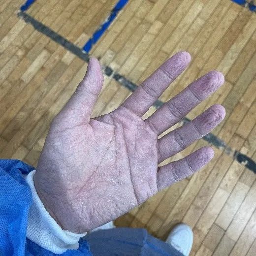 当然,参加这项工作也很累,最难受的是大夏天穿防护服汗流浃背。每次换班脱下防护服,前襟后背都是湿的,手套戴久了汗会把手泡皱。社区志愿者把一级防护的防护服叫“小蓝”,二级防护叫“大白”,辅助采样和录信息的岗位要穿“大白”,其余人穿“小蓝”。虽然“大白”捂着更热,可大家还是抢着穿“大白”。