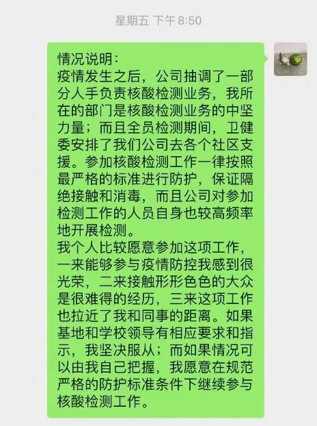 23号晚上,实践基地安排支队召开了紧急会议,提醒大家做好个人防护,不要扎堆聚集,少在外界暴露,建议从下周开始所有同学向单位申请线上办公。基地的提醒和要求是为了保护学生,但若是按照这项要求,我就无法继续参加核酸检测工作。尽管我很愿意继续做下去,但我知道这不是我一个人的事,需要在服从组织安排的基础上提个人意见。随后,我通过支队长和基地联络,汇报具体情况和意愿。基地的初步意见是以保护同学健康为最高原则,不建议我参加有感染风险的工作,需要详细了解个别情况,我便提交了情况说明。