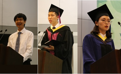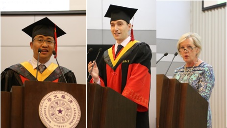 环四年级级主任张潇源代表教师发言,他强调“清华不是一个终点,而是一个起点”,勉励毕业生坚持追逐人生梦想。本科生代表董恒、硕士生代表金欣欣、博士生代表王政、留学生代表Gottfried Oliver分别发言,感谢师友给予的教导和帮助,感恩母校将“自强不息,厚德载物”的精神传递给他们。耶鲁大学森林与环境学院院长助理Joanne DeBernardo女士作为特邀嘉宾,充分肯定了耶鲁大学和清华大学联合培养所取得的成果,并希望毕业生们能真诚待人,珍惜友情,学会团结合作。