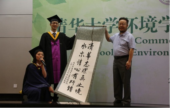 学院和毕业生互赠礼品。学院向每位毕业生赠送的是一套专属印章,边款还刻有环境学院标志及“行胜于言”四字,饱含学院对毕业生们牢记使命、脚踏实地的殷切期盼;毕业生们则向学院赠送了一幅书法作品,以“清华志环无止境,水木情心有所钟”两句话表达了昂扬进取的清华精神和对学院的眷恋感恩。