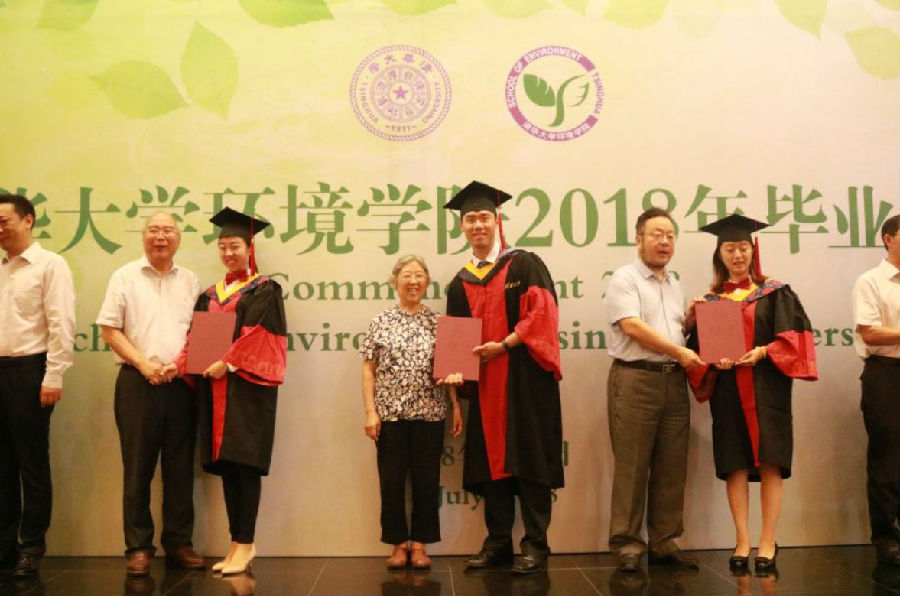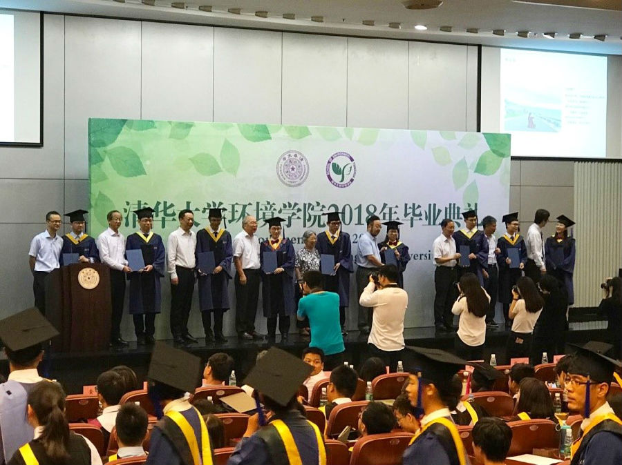 贺克斌首先通报了2018年本科生、研究生毕业情况。截至7月,环境学院共有94名本科生完成学业(包括5名留学生),其中93人获得工学学士学位;共有174名研究生完成学业(包括9名留学生),其中58人获得博士学位,63人获得工学硕士学位,38人获得工程硕士学位。刘毅宣读了北京市优秀毕业生、清华大学优秀和优良毕业生、清华大学优秀毕业论文奖和环境学院优秀毕业生的名单。席劲瑛宣读了清华大学毕业生启航奖获奖名单。