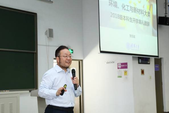 开学典礼上,环化材大类首席教授、环境学院院长贺克斌院士首先致辞。他代表环化材大类向2018级近250位新生来到清华、加入环化材大家庭表示热烈欢迎,并对培育他们的家长表示衷心感谢。他向同学们介绍了环化材大类各院系的历史沿革、学科建设情况和人才培养特色与优势,讲解了各专业的内涵以及对推动我国科技、经济和社会发展的重要作用。他指出,环化材大类是用新技术解决全球面临的资源、能源和环境挑战的组合,希望同学们不仅要在环化材大类学习知识、提升能力,更要具备责任感、使命感,开启人生的新征程。