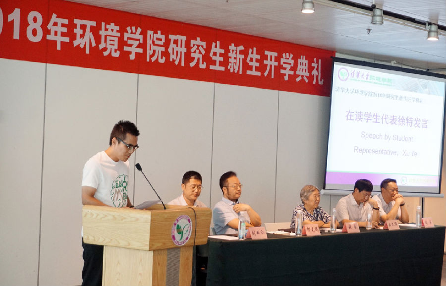 典礼还邀请三位学生代表发言。2016级直博生徐特作为在读研究生代表发言,他向新生们讲述了自己入学以来的成长与心路历程,希望新生们跳出以往的竞争思维,踏踏实实的开展研究,同时要注重理论结合实际,“将论文写在祖国大地上”。他还向新生们讲述了清华体育精神,鼓励同学们加强体育锻炼。2018级研究生新生代表李芸妃表达了自己对清华、对研究生科研工作的认知与理解,表达了自强不息、专心科研的决心。来自美国的Christopher Jordan Homer作为2018级国际学生代表,讲述了自己与清华结缘的故事,表示一定会珍惜在清华学习的机会,融入清华、融入中国。