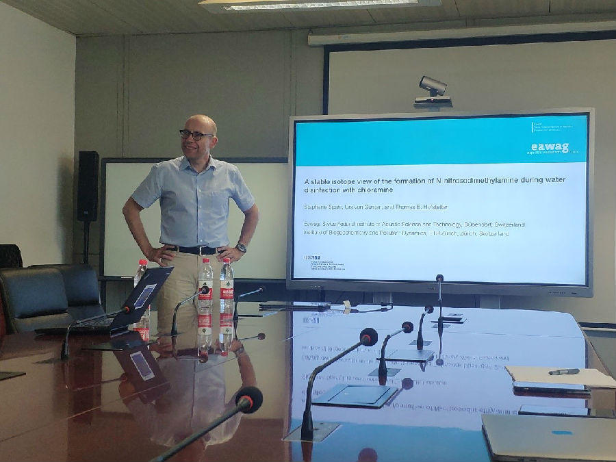 MK官网2019年8月21日电(通讯员 邱玉)8月19日下午,瑞士联邦水科学与技术研究所(Eawag)环境化学部门高级研究员Thomas B. Hofstetter做客环境学术沙龙第516期,作了题为《从稳定同位素角度研究氯胺消毒过程中亚硝基二甲胺的生成机理》(A stable isotope view of the formation of N-nitrosodimethylamine during water disinfection with chloramine)的学术报告。本次沙龙由饮用水安全教研所陈超副研究员主持,10余名师生听取了报告。