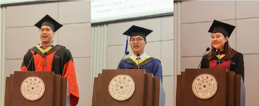 博士毕业生代表周杰文(比利时籍国际学生)回忆了自己在中国和清华学习生活的点点滴滴,对学院和导师的教导与帮助表示了衷心感谢。硕士毕业生代表任海腾介绍了自己的职业选择过程,充分表达了入主流、上大舞台和投身环境保护事业的决心和信心。本科毕业生代表李阳回忆了大学四年与同学们在一起的各种故事和美好瞬间,对未来美好生活进行了憧憬。