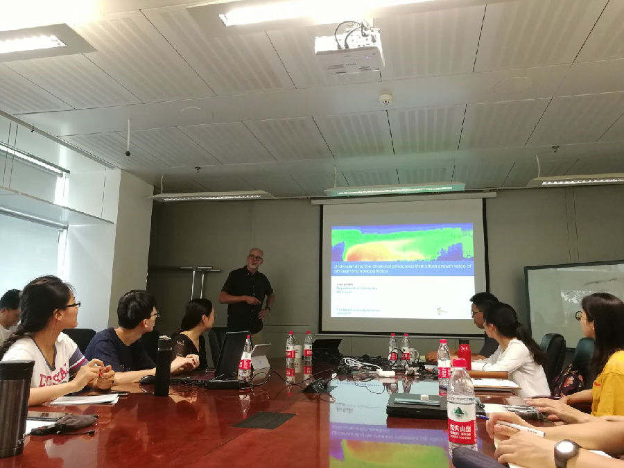 Smith教授重点介绍了大气中影响新粒子生成后初步生长阶段的化学过程及其在线检测技术。Smith教授首先探讨了大气新粒子生成现象和超细颗粒物对人体健康的影响。随后介绍了其与合作者研发并不断改进的静电捕集热脱附化学电离质谱(Thermal Desorption Chemical Ionization Mass Spectrometer),该仪器结合了先进的纳米颗粒物荷电和粒径筛分技术,将大气颗粒物分子层面化学组分的在线粒径检测下限由40纳米降低到5纳米。接下来,Smith教授介绍了基于该仪器开展大气外场测量和实验室研究所取得的最新进展。在芬兰森林的观测发现,多元饱和羧酸以及含氧数大于5的有机物与新粒子生成与生长有较强的相关性,并探讨了其对大气新粒子的可能贡献。在酸碱反应均相成核的实验室流动管实验中,以硫酸和氨气成核、硫酸和二甲胺成核、硝酸和氨气成核为例,揭示了酸性前体物与碱性前体物成核后颗粒物的酸碱比例随粒径的变化主要取决于酸碱团簇的稳定性,相对湿度也会有一定影响。讲座结束后,在场师生踊跃提问,气氛热烈,与Smith教授进行了深入的沟通与交流。