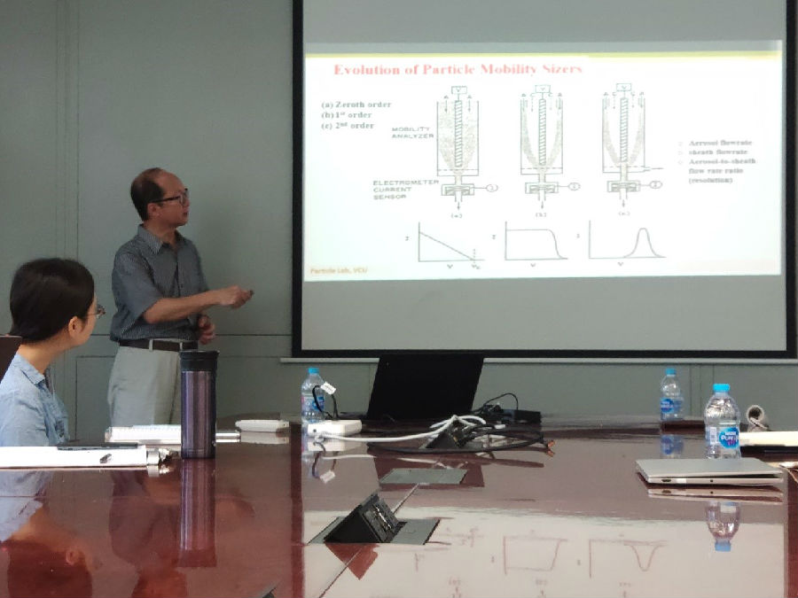 MK官网2019年5月21日电(通讯员 陈小彤)5月17日上午,美国弗吉尼亚联邦大学讲席教授、清华大学讲座教授Da-Ren Chen做客环境学术沙龙第494期,做了题为《测量细颗粒物和超细颗粒物的小型化电迁移率粒径谱仪》(Miniaturization of electrical sizers for fine and ultrafine particles)的学术报告。本次沙龙由大气污染控制教研所蒋靖坤教授主持,30余名师生听取了报告。