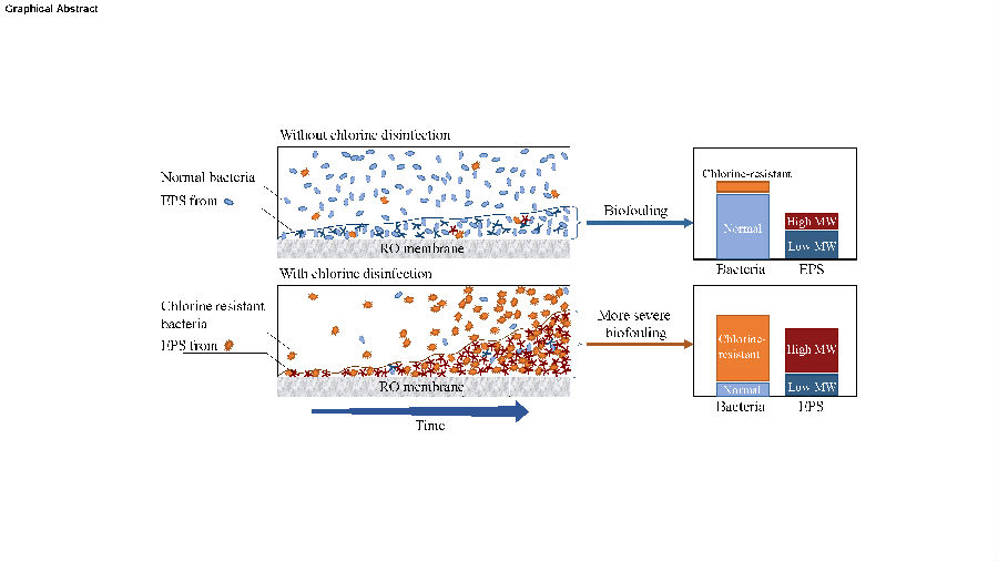 RO膜的生物污堵是污水再生处理RO工艺高效、稳定运行面临的突出难题。目前,主要通过消毒预处理削减RO系统进水中的微生物量、在运行中投加非氧化性抑菌剂等手段对其进行控制。氯消毒是污水处理过程中最常用的微生物灭活手段。然而,该研究却发现氯消毒虽然可有效灭活反渗透(RO)系统进水中的微生物,但却导致了更加严重的生物污堵。