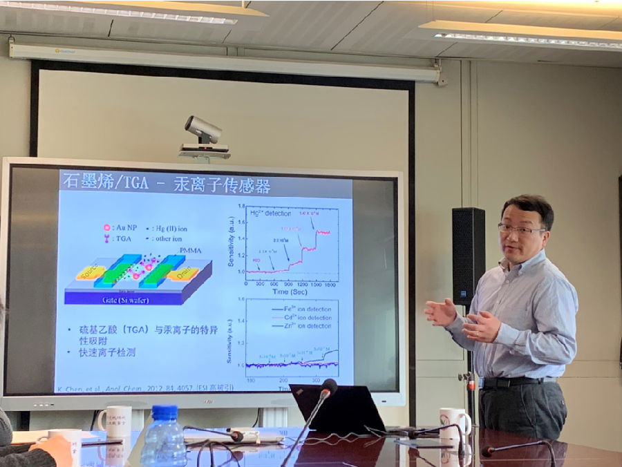 毛舜教授首先从目前的环境分析需求方面展开了报告内容,包括气体监测、城市水质监测、海洋水质监测、家居环境监测以及在线水质分析仪器等。接着介绍了场效应晶体管传感器,其原理是利用通道材料结合靶标分子后电导率发生变化进行检测,通道材料为二维纳米材料,该传感器的特点是可实现对目标物的实时、原位、高特异性、高灵敏度检测。随后介绍了场效应晶体管传感器系统的构建,包括电极的制备及通道材料的选择,并详细讲解了其在气体检测(二氧化氮)、生物检测(蛋白质)、水质检测(重金属、氮、磷、抗生素)中的应用。最后,从实用性、稳定性和重现性三个方面对场效应晶体管传感器的挑战和应用进行了分析,并提出了相应的措施。讲座结束后,在场师生踊跃提问,气氛热烈,与毛舜教授进行了深入的沟通与交流。