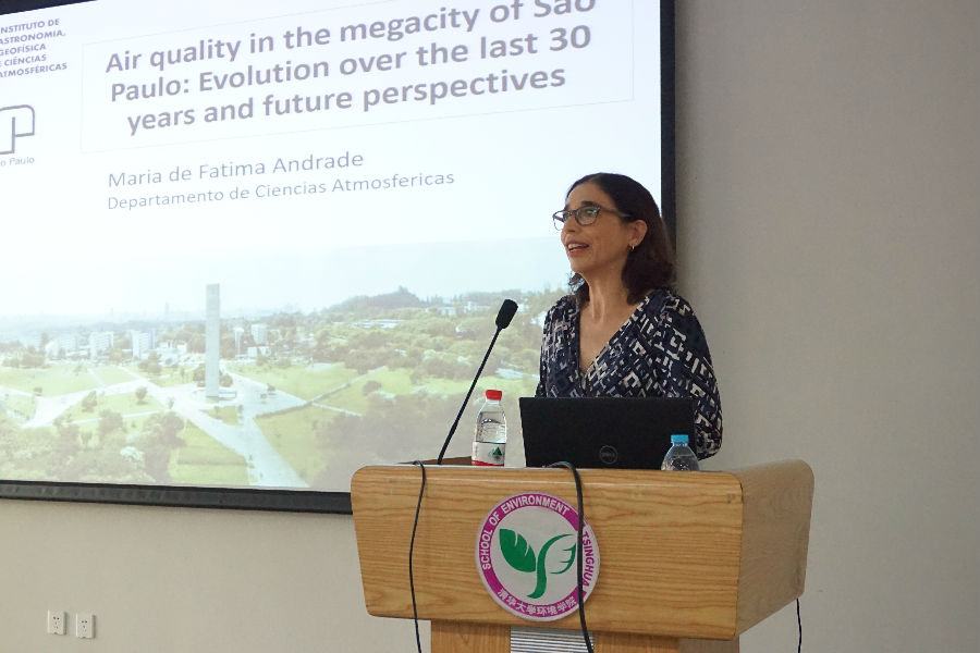 Maria de Fatima Andrade教授重点介绍了30年来圣保罗市的空气质量变化以及各种政策对该城市空气质量的影响。圣保罗市是南美洲最大的城市,在近30年,政府出台了一系列措施来控制污染物排放,以改善当地的空气质量。目前,圣保罗市空气质量最大的挑战在于二次污染物,主要是臭氧和颗粒物,主要涉及的部门为交通部门。在讲座结束后,Maria de Fatima Andrade教授与到场的师生进行了深入的沟通与交流。