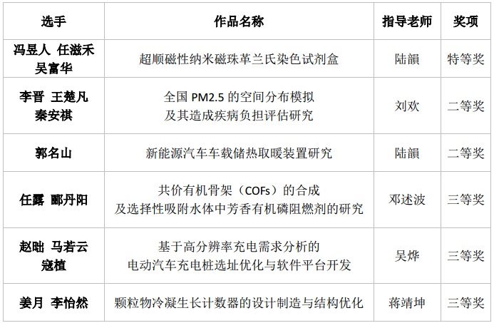 此外,环境学院李佳聪、孙若水与材料学院胡铉昕共同完成的作品“基于静电纺丝技术的微生物燃料电池原位芬顿污水处理系统”经材料学院选送获得二等奖 。