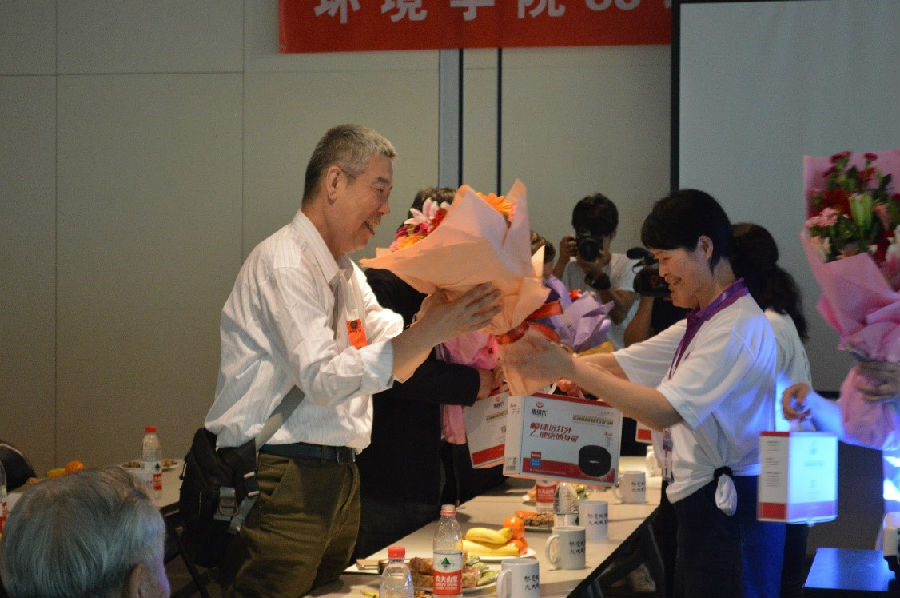 座谈会开始,主持人介绍了出席的老师并回忆了当时老师们的授课场景。紧接着,环31 班和环32班在场校友一一介绍了自己的现状并向老师献花,表示非常感谢老师们当年的授业解惑,感谢老师给予自己的知识底蕴以及对自己事业上的帮助。环32班校友环境学院马永亮副教授表示当年老师们培养的“不服输”的精神一直鼓励着自己前行。