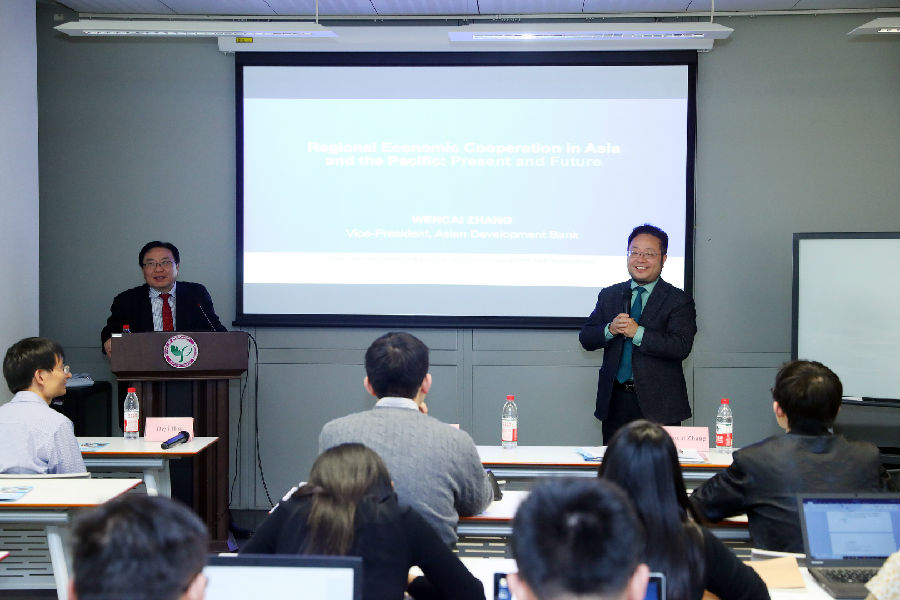 张文才先生在报告中指出,近几十年亚太地区在经济发展和贫困消除方面取得了惊人的成就,使得亚太成为了全球最具活力、发展最快的地区。谈及未来发展,他又从全球层面和区域层面提出了亚太地区面临的许多挑战,包括贸易保护主义、贸易对欧美地区的过度依赖、气候变化和自然灾害、恐怖主义、地缘政治问题以及金融风险的防范。从区域层面讲,各次区域之间发展不均衡、各个国家参与合作的能力差异较大、区域内金融合作滞后于投资贸易合作以及市场结构性问题都是未来亚太地区实现经济长期增长所要面临的挑战。此外,张文才先生还介绍了亚洲开发银行促进区域经济发展所采取的措施,包括设立亚行2020计划和积极参与次区域倡议。他还特别介绍了亚行在环境领域的实践经验,包括项目审查标准以及生态环保项目的参与。最后,张文才先生热情邀请清华学生参与到亚行等国际组织中来,充分利用自己的知识储备和能力,为国际发展事业做出贡献。