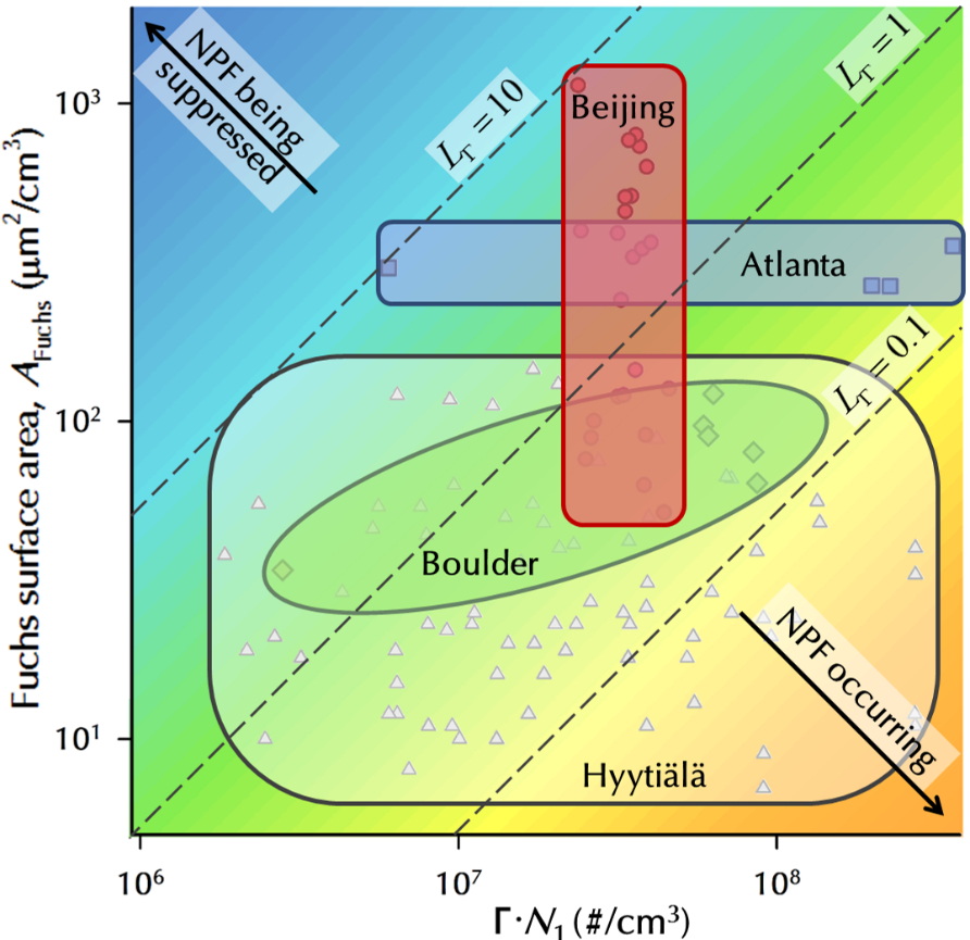 研究组进一步同南京信息工程大学环境学院郑军教授研究组合作,在北京联合开展大气外场观测,研究结果表明大气颗粒物表面积浓度可以有效预测北京地区的新粒子生成事件,说明凝并去除效应是北京地区新粒子生成事件的主控因子,这同欧美相关大气站点的发现有显著不同。上述研究成果强调了凝并去除效应在强新粒子生成事件中的主导地位,将有益于进一步认知我国典型城市大气环境中二次新粒子生成现象的特征和机理。