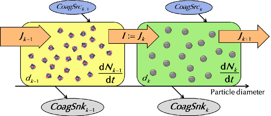 用于推导新粒子生成速率公式的离散模式气溶胶通用动力学方程示意