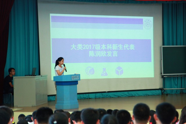 来自化工系的陈润欣代表全体新生发言。她表达了考入清华的喜悦和对老师、家长的感激,憧憬着在这个崭新的起点,师承良师、收获益友,翻开人生更好的篇章。