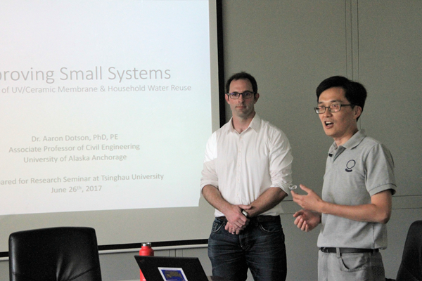 MK官网2017年06月27日电(通讯员 邱玉)6月26日下午,美国阿拉斯加大学安克雷奇分校副教授Aaron Doston博士做客环境学术沙龙第359期,作了题为《紫外/陶瓷膜工艺和小型家庭回用水处理系统》(Improving Small Systems: Development of UV/Ceramic Membrane & Household Water Reuse)的学术报告。本次沙龙由饮用水安全教研所陈超副研究员主持,20余名师生听取了报告。
