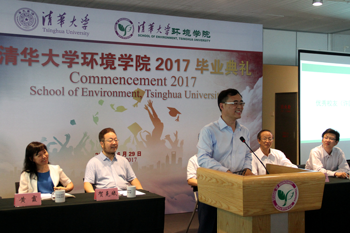 中持环保发展有限公司董事长许国栋作为校友代表致辞。许国栋说,未来五十年将是一个创变的时代,科技将推动社会产生深刻地变革,中华民族的环境梦也将在未来五十年基本形成,环境事业将从污染治理逐步过渡到环境的修复、建设、创造与融合,这对于各位毕业生来说是极大的机遇和责任。最后,他以“肩负社会责任”与学弟学妹共勉,期望清华人勇于肩负推动进步、造福人民的责任,以责任担当为母校增添更多荣光。