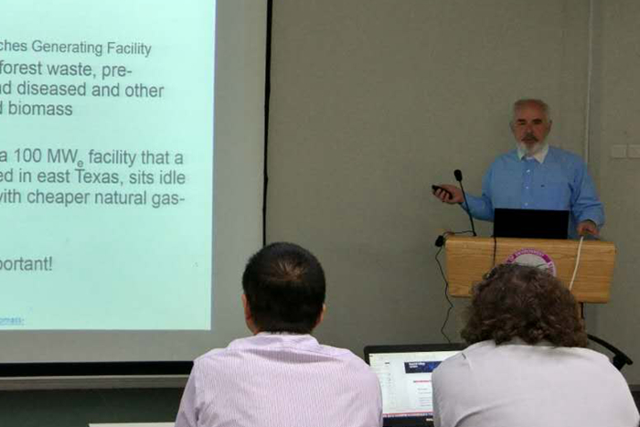 Anthony教授重点介绍了生物质的热解气化在发电方面的应用。一方面,目前已经有部分生物质,例如林业废弃物,被应用于气化发电;另一方面,目前实现商业化应用的只有很小一部分种类的生物质,如何将更多的生物质热解气化实现商业化利用需要更多的研究。Anthony教授特别强调了流化床燃烧技术在生物质热解气化方面的应用,该技术在生物质热解气化领域实现了部分商业化,但进一步的推广还需时日。最后,Anthony教授指出了生物质利用的一个新前景,即与碳捕集与封存技术联用。在讲座结束后,Anthony教授与到场的师生进行了深入的沟通与交流。