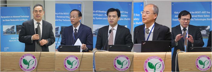 中国科技部国际合作司姜小平、环境学院胡洪营、环境学院刘书明、AIST田尾博明、AIST王正明在会上发言(左起)