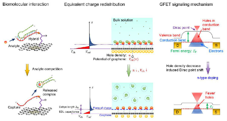经实验验证,本研究报道的High-κ solid-gate GFET新器件(图1)同时具备液栅GFET器件的低操作电压和背栅GFET器件的易于集成的优点。通过对石墨烯新器件进行功能化修饰,本研究实现了基于DNA适体竞争机制的新型环境污染物卡那霉素检测。此外,通过对水溶液-石墨烯敏感界面上带电生物分子分布进行的电子学理论分析,本研究提出了描述生物分子间亲和作用形成GFET器件电信号输出模型(图2)。该模型对GFET亲和型生物传感器的设计与优化具有重要的参考价值。