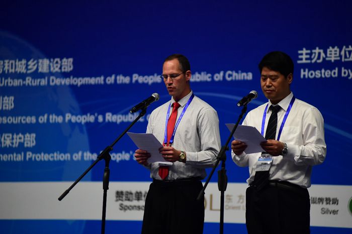 贾海峰与Scott Struck宣读《城市低影响开发雨水管理——北京共识(草案)》