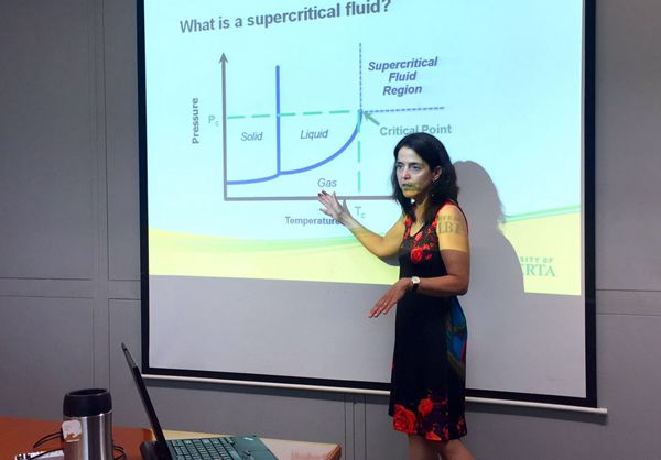 Selma Guigard博士重点介绍了超临界流体的特性以及其研究组利用超临界CO2流体从石油钻井废物中提取碳氢化合物和从油砂中提取沥青的研究工作。