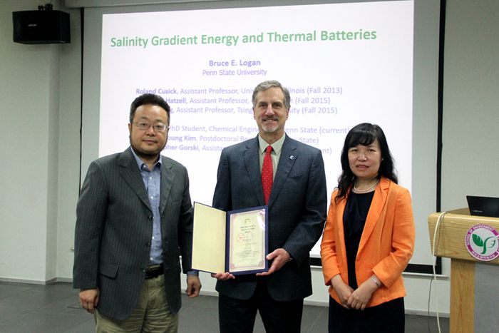 环境学院学术委员会主任黄霞教授主持仪式,并介绍了罗根教授的教育工作背景和主要学术成就。院长贺克斌教授代表环境学院对罗根教授多年来对学院教学科研以及青年教师培养等方面所做的贡献表示衷心感谢,并希望罗根教授今后持续支持学院发展,发挥更大的作用。随后,贺克斌宣读了清华大学聘请布鲁斯·罗根为杰出访问教授的聘书,并向罗根教授颁发聘书。仪式后,罗根教授为环境学院师生做了题为《盐差能和储热电池》(Salinity Gradient Energy & Thermal Batteries)的学术报告。