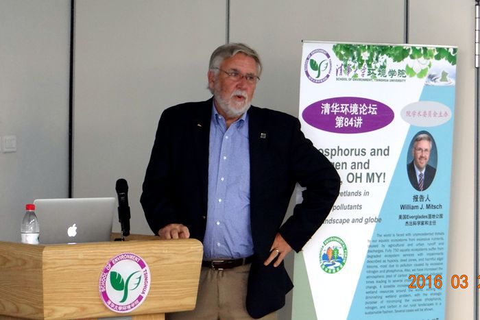 环境学院2016年3月24日电(通讯员 王丝可) 3月24日下午,美国海湾大学艾维格来得(Everglades)湿地公园主任、俄亥俄州立大学(The Ohio State University )名誉教授威廉·密茨(William Mitsch)做客清华环境论坛第84讲,作了题为《令人震惊的磷、氮和碳! 湿地在减轻我们景观及全球污染物中的作用》(Phosphorus and Nitrogen and Carbon, OH MY! The role of wetlands in mitigating pollutants in our landscape and globe)的学术报告。环境生态学教研所刘雪华副教授主持了此次论坛,近50名师生听取了报告。