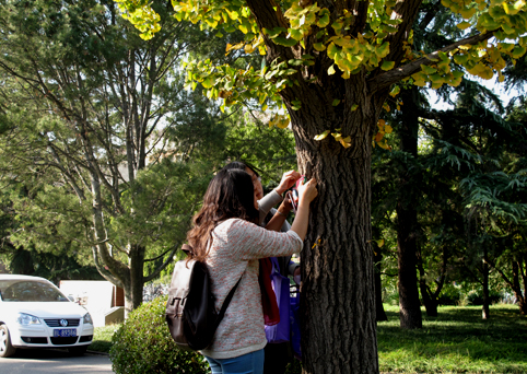 同学们在校园中挂树牌。