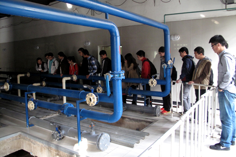 同学们参观校园中水站。