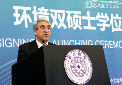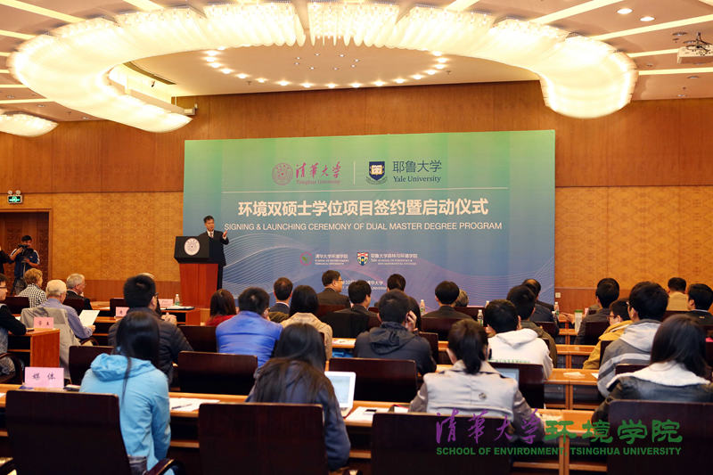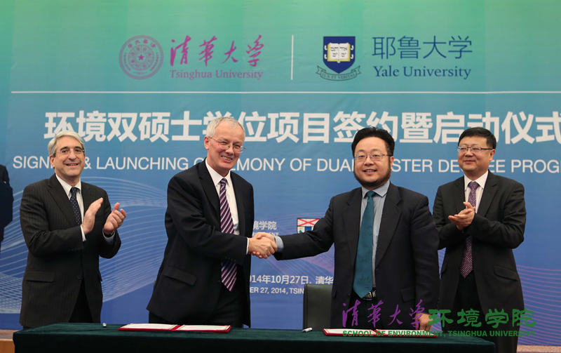 陈吉宁在签约仪式上致辞。他说,清华大学与耶鲁大学的合作历史悠久且卓有成效。此次双方签署环境双硕士学位项目,在两校合作关系发展中具有里程碑式的意义,不仅将进一步深化双方合作,还将创新人才培养模式,培养应对环境挑战的未来领导者。相信研究型大学可以通过紧密的合作,共同为应对全球挑战作出贡献。