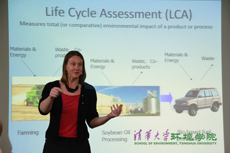 米勒女士首先介绍了生命周期评价(LCA)在环境领域的重要性,并提出了新能源、新技术的环境影响评价这一理念,阐述了技术应用如何影响环境影响评价。在报告中,米勒女士还介绍了利用种植柳枝稷(switchgrass,美国本土的一种多年生植物,生长迅速、易于存活)来代替传统能源过程中的技术应用评价。报告之后,米勒女士还与现场师生进行了互动问答。