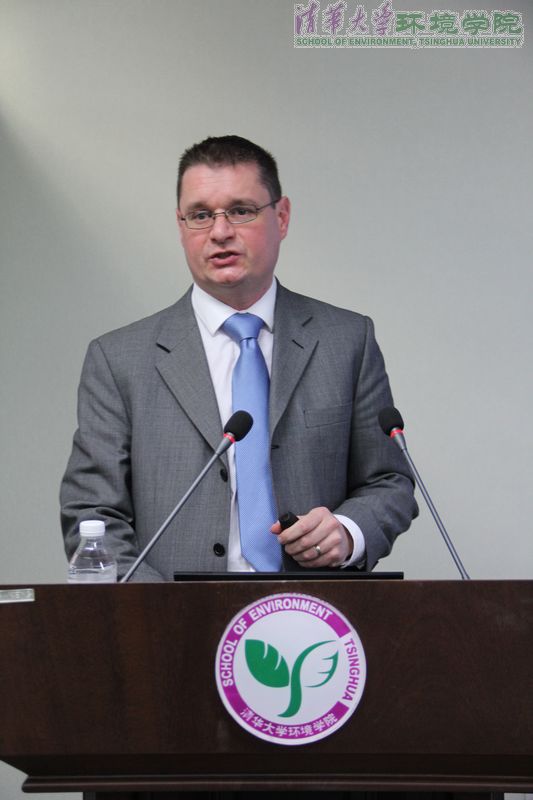 德斯科瑞教授首先简要介绍了当今世界水资源的分类、可用水资源现有量等,并分析了世界各地水资源短缺和污染的现状。他强调,水资源的污染将加剧水资源的短缺,因此是全球各地面临的重大环境问题。随后,他介绍了他所在研究组自主研发的污水处理技术,即用光催化的方法在膜上载入钛氧化物,该技术可成功有效地降解污水中的有机物质。他进一步指出,目前污水处理常规工艺主要为生物法,其所面临的主要挑战是后续大量污泥处置的问题。