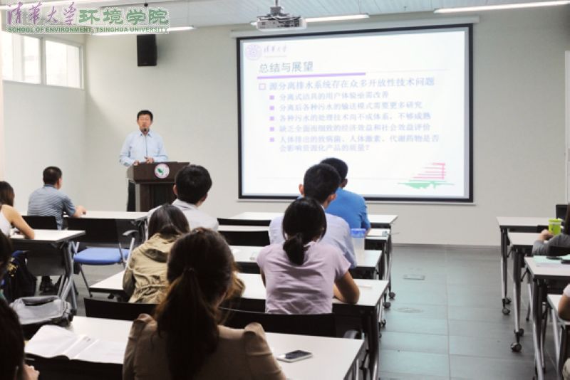 汪诚文教授介绍,源分离排水系统与传统城市排水系统相比,在污水回用、氮磷元素利用方面有独特优势。通过城市生活污水源头式分离——即黄水(尿液污水)、褐水(粪便污水)、灰水(洗衣洗漱污水)的分离式收集处理,可促进水的再生回用、氮磷钾资源的回收以及生物质的利用。与德国、瑞士等欧洲国家相比,国内的源分离排水技术起步较晚,但是发展迅速。北京奥森公园是世界面积最大源分离排水工程,而环境学院的院馆——清华中意环境节能楼是国内第一个集负压和全分离式排水于一体的示范工程。