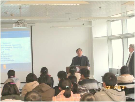 随后,在向同学们简略介绍了景色优美而历史悠久的伊利诺伊大学后,斯诺因克教授向大家揭示了美国饮用水方面存在的问题,如:水资源短缺、年久失换的饮用水供应系统、由于水运输而造成的能耗以及废水利用问题等。这些都使同学们认识到:水资源问题是一个全球性的问题,解决水资源问题刻不容缓。