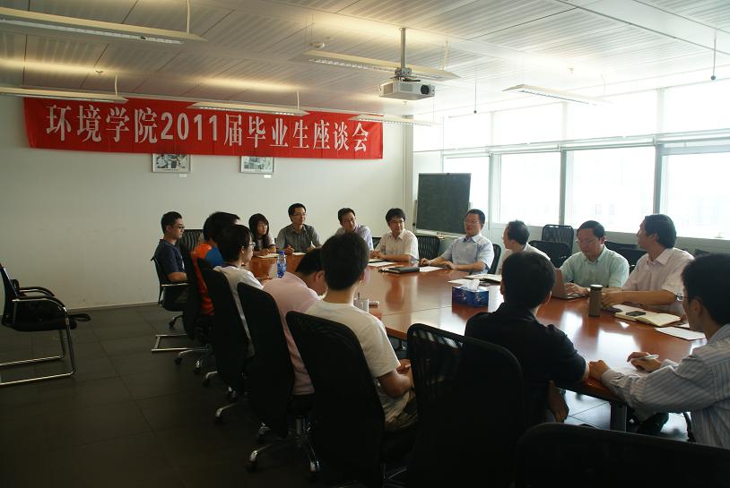 2011年6月26日下午,环境学院2011届毕业生座谈会在中意环境节能楼705会议室举行,院长余刚、党委书记杜鹏飞、副院长左剑恶、党委副书记刘建国以及研究生工作组和学生组负责人与11名2011届本科生和研究生毕业生代表举行座谈,校党委研究生工作部部长张小平应邀出席。座谈会由刘建国主持。