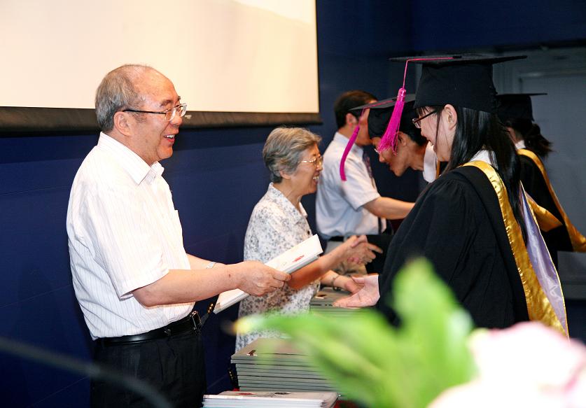 郝吉明首先向大家表示祝贺,祝贺他们选择了清华大学,选择了环境学科,“这是一个正确的选择。”他说,“我刚刚得知有40余名同学还要继续深造,这也是一个正确的选择。”同学们大笑。随后,他用一系列数据向同学们证明了清华大学研究生教育和环境学科的实力。他说:“全国环境学科一共评出了11篇优秀博士论文,(我们)环境系(学院)一共5篇,很遗憾,还没到一半,再努力一下就是一半。”热烈鼓掌,开怀大笑,同学们在意犹未尽的幽默中感受到郝老师的殷切期望。最后,郝老师向大家一一解释了他在毕业纪念册上致同学们的赠言:“求真务实,厚道为人,追求真理,报效祖国“,他鼓励大家锻炼身体,为祖国健康工作五十年,并要求党员同学做出表率作用。