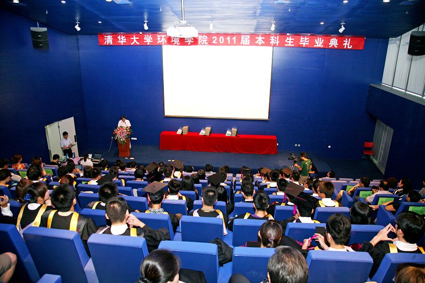 3:30,报告厅,左剑恶老师宣布毕业典礼正式开始,全体起立唱国歌。随后,刘建国老师向大家通报2011届本科生的毕业情况。据了解,2011年,环境学院共有81名本科生顺利毕业,获得工程学士学位。其中,69人获得环境工程专业工学学士学位,12人获得给排水工程专业工学学士学位。81名毕业生中,44人将在清华大学或其它院校继续攻读硕士博士学位,25人出国留学深造,12人参加工作。