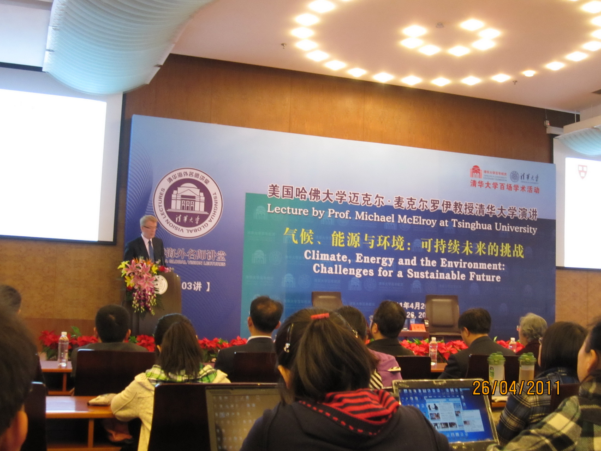 麦克尔罗伊教授首先介绍了地球上全年和全球意义上的能量平衡状况,以及地球上的垂直气温分布,指出温室效应导致全球气温升高,并向大家讲解了导致产生温室效应的几种温室气体,它们在历史上的浓度变化,和它们对全球气候的影响。麦克尔罗伊在报告中指出,中美两国是世界上二氧化碳排放量最大的国家,这与两国化石能源的消耗紧密相关。因此开发新的替代性能源势在必行。麦克尔罗伊教授分别介绍了中美两国的风力发电现状,指出两国在风力能源利用上还存在巨大的潜力。他提出,两国应在新能源开发利用和研究上大力合作,为建设可持续发展的未来共同努力。