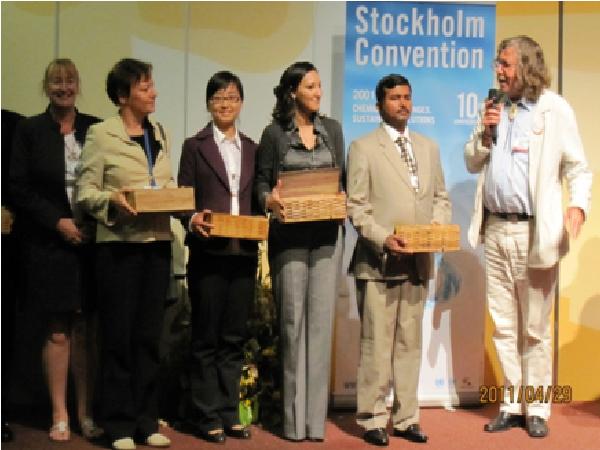 2011年4月28日,在瑞士日内瓦举办的关于持久性有机污染物的斯德哥尔摩公约第五次缔约方大会上,MK官网教授、巴塞尔公约亚太地区协调中心/斯德哥尔摩公约亚太地区能力建设与技术转让中心执行秘书李金惠获得了2011年斯德哥尔摩公约多氯联苯消除网络(PEN)信息奖。该奖项旨在表彰李金惠教授在促进持久性有机污染物尤其是多氯联苯的信息交流方面做出的贡献。环境学院、巴塞尔公约亚太地区协调中心/斯德哥尔摩公约亚太地区能力建设与技术转让中心赵娜娜(下图右三)代表李金惠教授领奖。同时获此殊荣的还有来自摩尔多瓦、马其顿、意大利、尼泊尔、哥伦比亚、摩洛哥和瑞典的其他7个单位或个人。