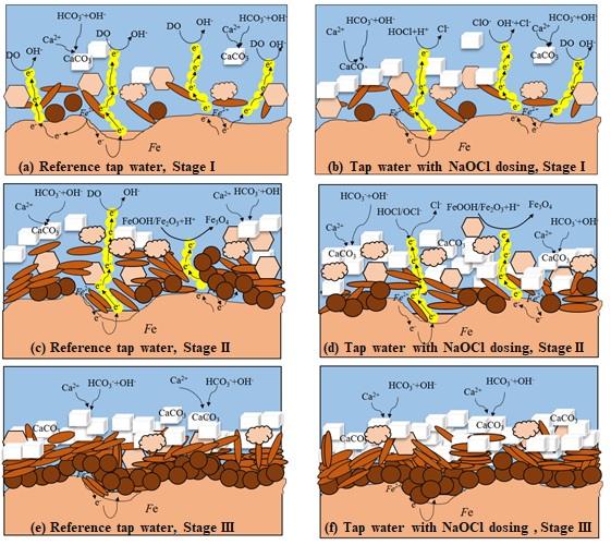 该研究结果表明,与传统的游离氯消毒不同,投加次氯酸钠消毒剂可影响碳酸钙在管壁的附着倾向和沉积量,进而影响球墨铸铁的腐蚀过程和腐蚀产物的转化过程,并在此基础上提出了投加次氯酸钠消毒剂对管网腐蚀和管垢发育的三阶段概念模型。该研究对于供水、排水、再生水管道研究和工程实践有很好的指导价值。
