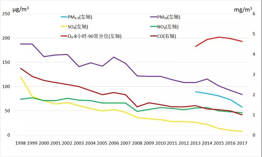 他指出,2013-2017 年是北京市大气污染控制历程中措施最系统、力度最大的5年。2017 年,北京市环境空气中细颗粒物(PM2.5)的年均浓度从2013年的89.5微克/立方米下降到58微克/立方米,整个京津冀区域实现了PM2.5年均浓度较2013年降低25%的目标,其中,北京下降了35.6%。在诸多治理措施中,燃煤锅炉治理、民用燃料清洁化、产业结构调整对大气环境质量改善的贡献最为显著;这5年间,北京市的SO2、氮氧化物(NOx)、挥发性有机物(VOCs)、PM2.5年排放量分别下降了83%、43%、42% 和55%。