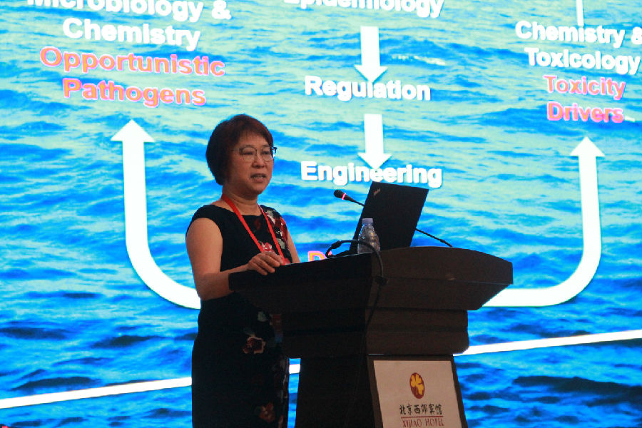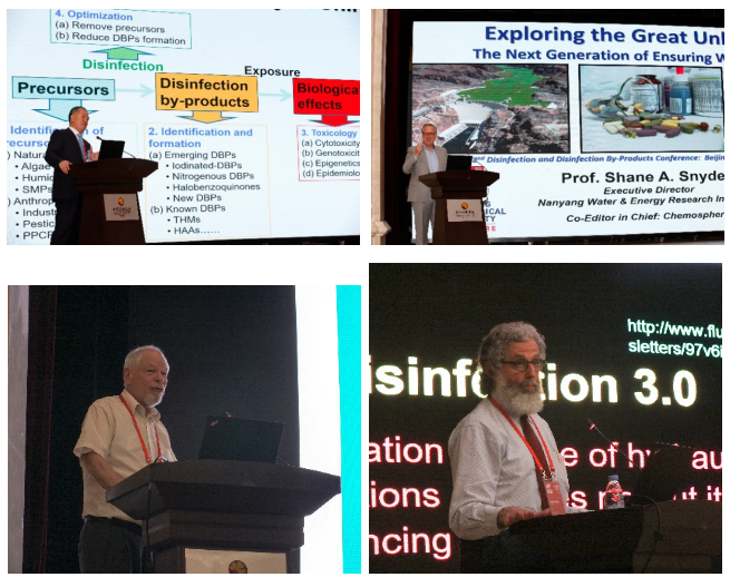 大会名誉主席、中国科学院院士江桂斌,新加坡南洋理工大学教授Shane Snyder,美国加州大学洛杉矶分校教授Mel Suffet,美国德克赛尔大学教授Charles N. Haas做大会报告