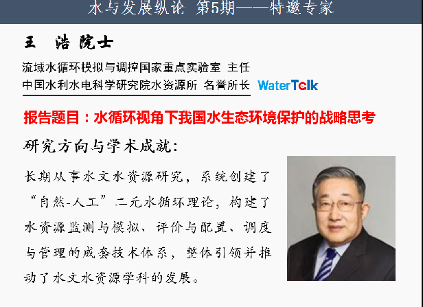 “水与发展纵论”是以网络会议形式举办的公益性学术报告论坛,目的是给大家提供一个探讨水与社会经济发展、水与生态环境相互关系的平台,为促进环境学科发展做出积极贡献。同时,论坛的另外一个重要目的是为在新冠肺炎疫情防控期间,居家学习的研究生、本科生,提供聆听资深专家报告、和专家进行交流的机会,以开阔视野、激发思考,充实生活。