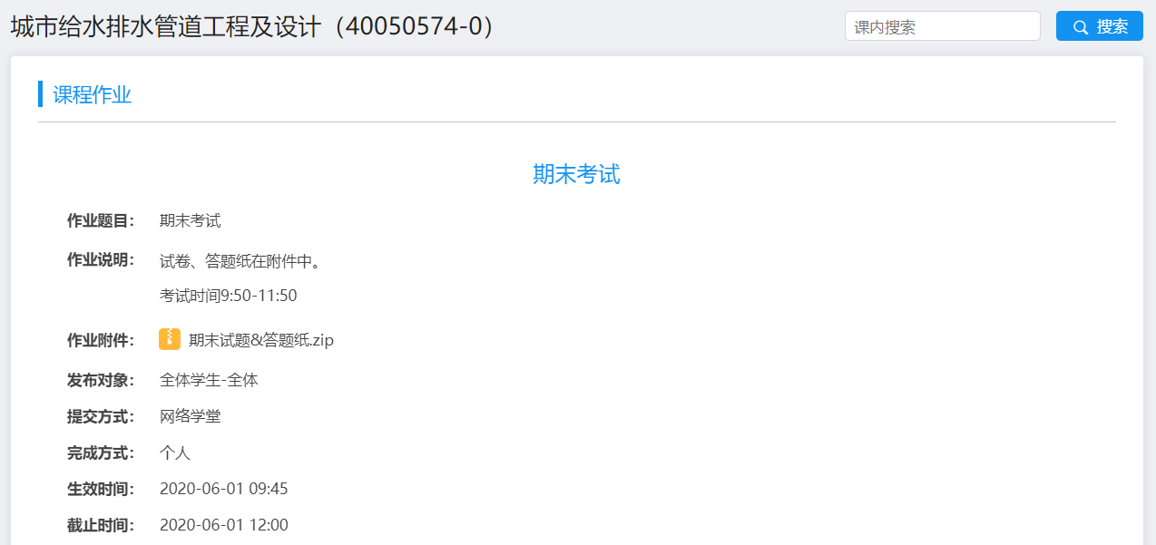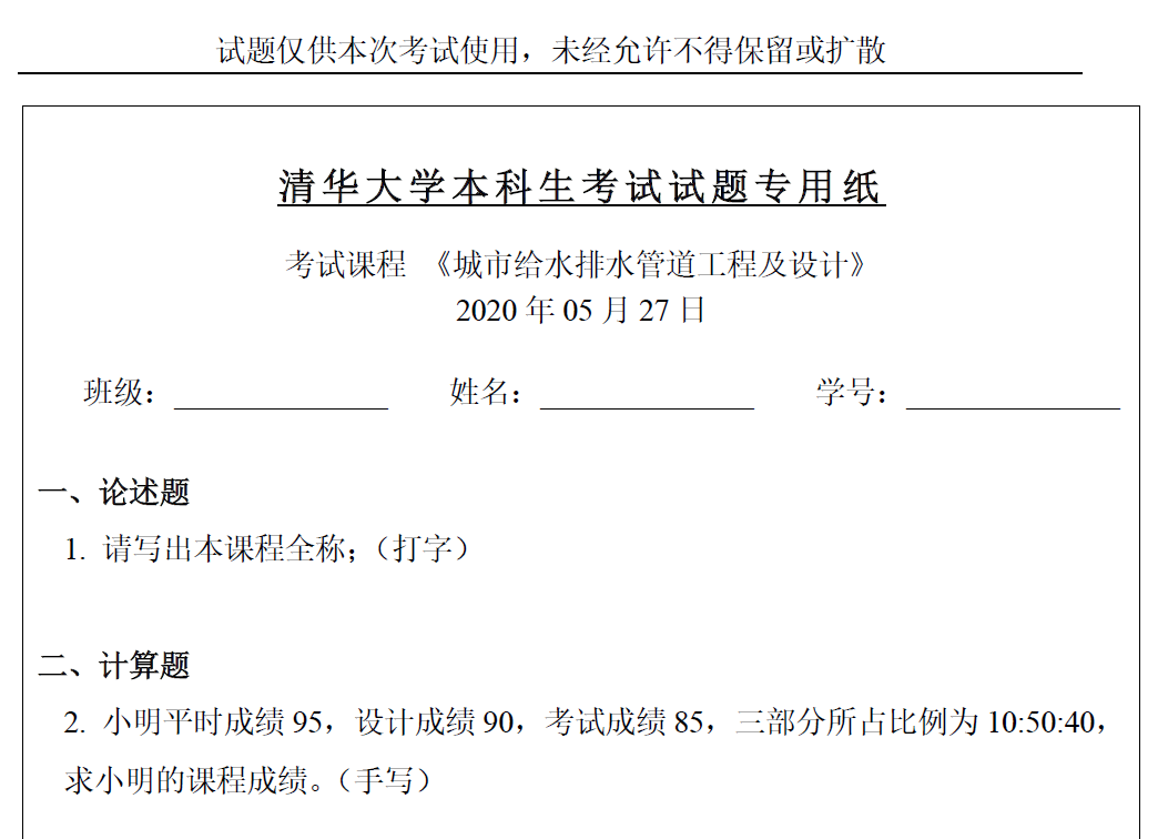 考虑到远程考试的特殊性,考试题目全部采用主观题(简答和计算),并将计算题中的个别系数设置为与学生的学号相关以确保考试的公平性。为保障考试信息传递的准确性,采用pdf的形式发放试卷和回收答题纸,而在word版本的答题纸里提供试卷中表格数据以方便同学编辑。
