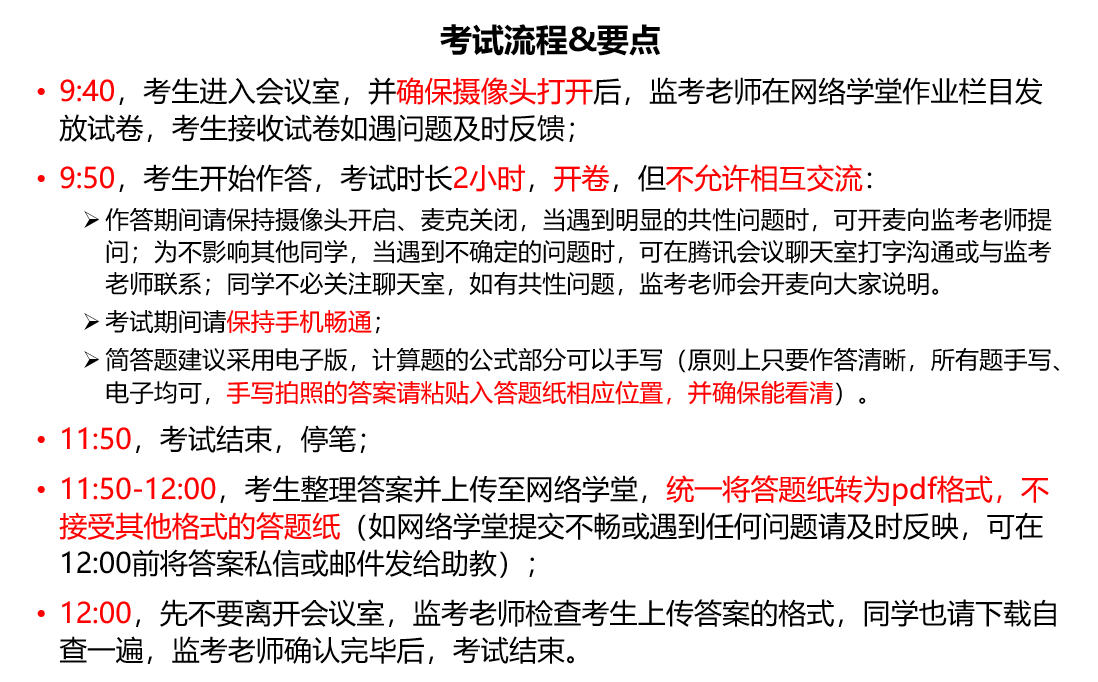 9:40,同学们陆续进入会议室,汪诚文老师强调了考试纪律,并要求同学们打开摄像头,刘书明老师和刘艳臣老师就部分题目的答题规范进行了说明,之后由助教在网络学堂发放试卷和答题纸。