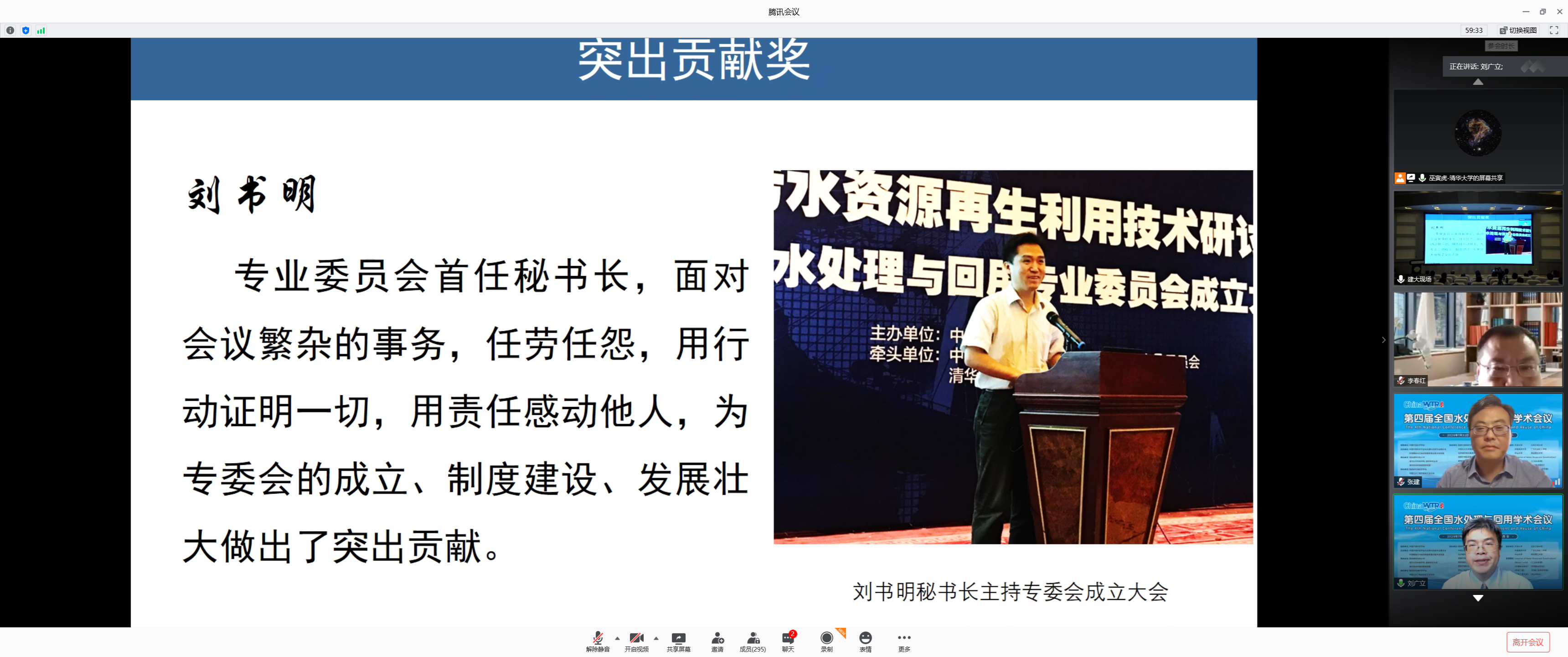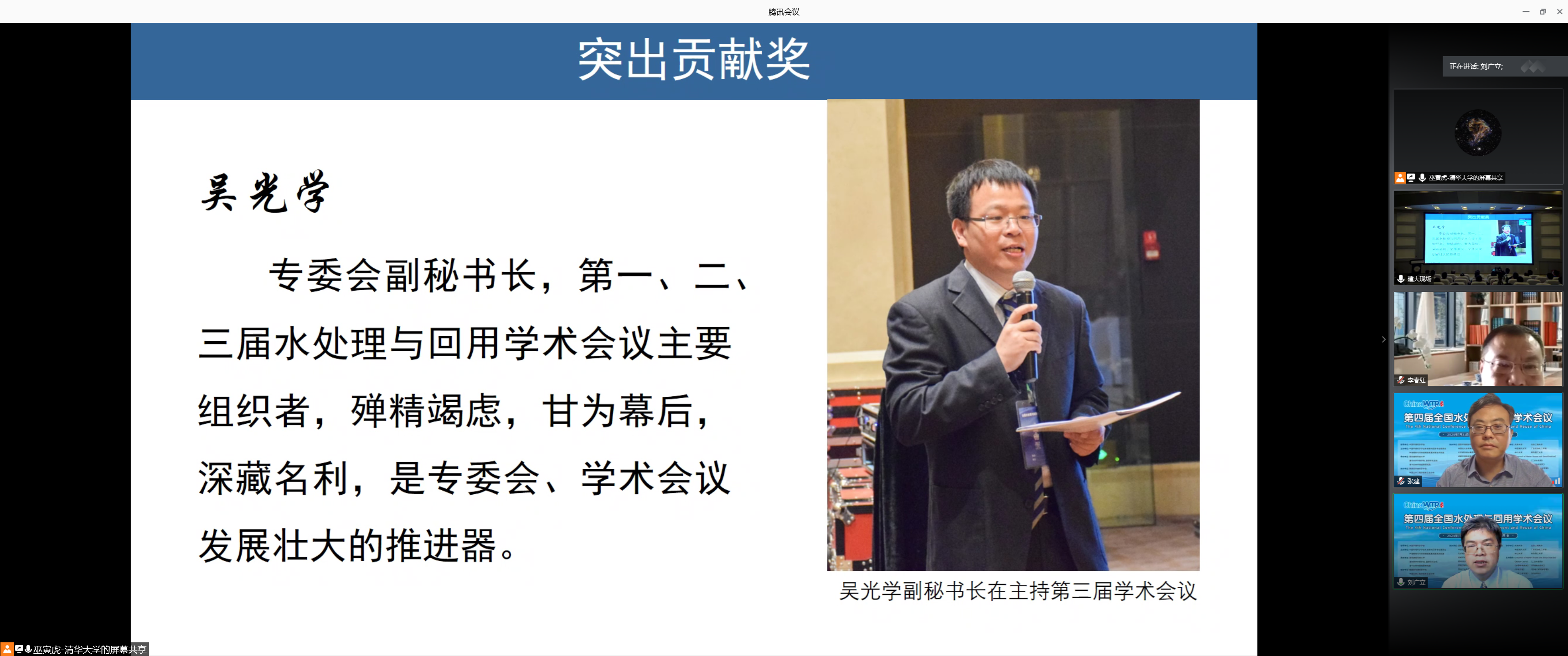 会议期间,专业委员会首任秘书长、清华大学教授刘书明和副秘书长、清华大学国际研究生院副教授吴光学被授予“水处理与回用专业委员会突出贡献奖”,以表彰了他们为专业委员会的成立、制度建设、会议组织和发展壮大做出的突出贡献。会议颁发了“水处理与回用领域年度全国优秀中文论文奖”、“优秀会议论文/报告奖”和“学术会议优秀组织奖”。